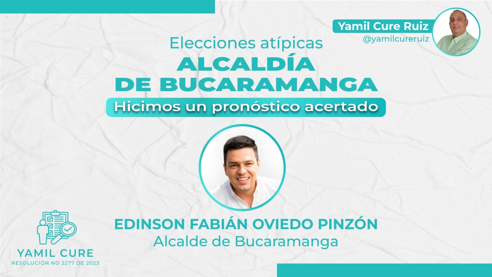 El encuestador santandereano Yamil Cure Ruiz, autorizado mediante la Resolución 2277 de 2023, reveló los resultados de su más reciente estudio de intención de voto para las elecciones atípicas a la Alcaldía de Bucaramanga.