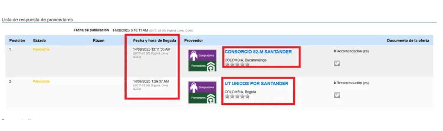 - Consorcio 82-M Santander, que radicó su propuesta a las 12:11 a.m. del 14 de agosto.